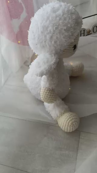 This adorable handmade lamb is crafted from soft white yarn, giving it a fluffy texture that mimics real sheep’s wool. With large expressive eyes, a tiny embroidered nose and mouth, this plush lamb is irresistibly cute.