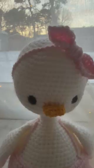 This adorable handmade amigurumi duck is the perfect cuddle companion for your little one! Made from soft white yarn with a yellow beak and feet, this charming duck is dressed in a cute pink dress with a matching bow. Its lovely design and cozy texture make it a wonderful gift for any child.